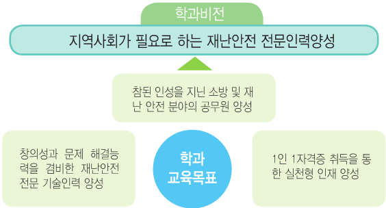 소방방재학과에서는 체계적인 교육을 통해 사회에서 꼭 필요로 하는 인력 양성을 위해 학과의 비전을 "지역사회가 필요로 하는 재난안전 전문인력 양성"으로 설정하였으며 다음과 같은 교육목표를 설정하였다.